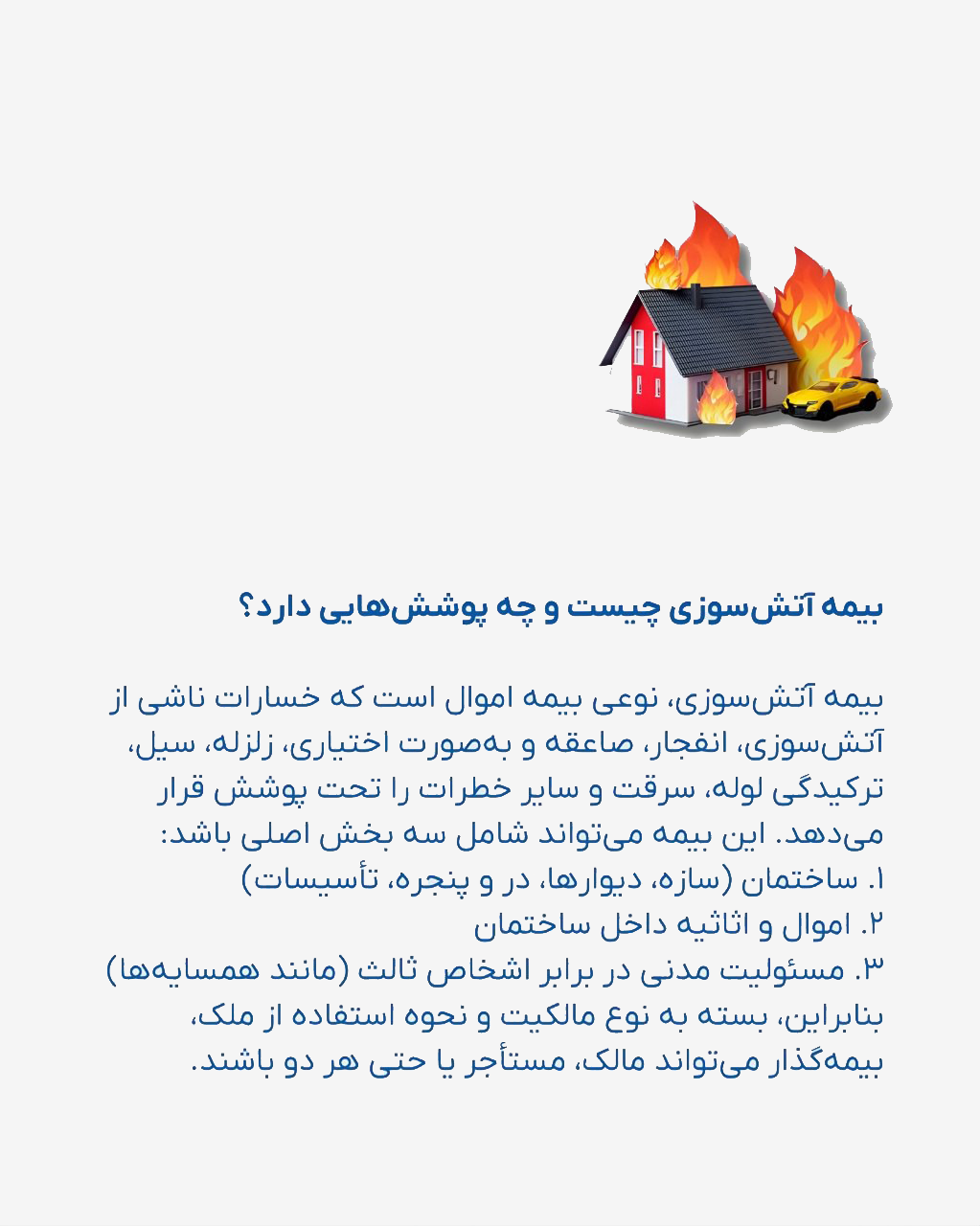 بیمه آتش سوزی پوشش خسارت ناشی از آتشسوزی، انفجار، صاعقه و همچنین خطرات اضافی مانند زلزله، سیل، طوفان و سرقت به اموال منقول و غیرمنقول.